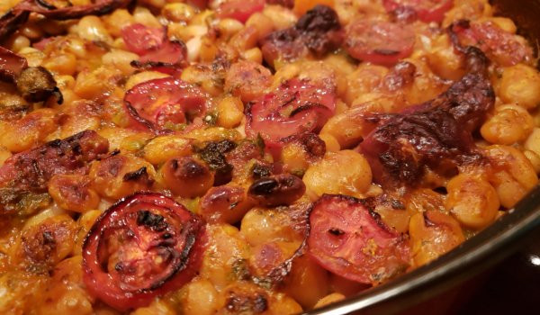 Останалият домат се нарязва на кръгчета и се нарежда върху боба.