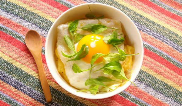 Изпържваме 3 яйца на очи и по желание ги поръсваме с хималайска сол. В порциите поставяме яйцето върху качамака, като като капаче и поднасяме качамака с яйца украсен със стръкчета бейби рукола. / Снимка: Илиана Първанова, gotvach.bg/
