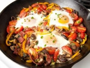 Задушават се на слаб огън около 10 минути, посоляват се, върху получената смес се счупват яйцата и без да се разбъркват се пържат до забулването на белтъка.