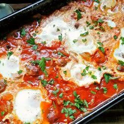 Вземете тавичка, изсипете сместа в нея и отгоре чукнете яйцата с разстояние едно от друго.