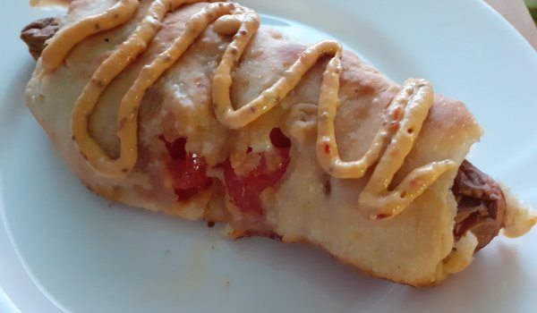 Подреждате всичко в средата на тестото, а след това подхващате едната страна и загръщате продуктите. Същото правите с другата страна и внимателно повдигате така оформената кренвиршка/саламка от чинията и я пренасяте в близката тава, като я обръщате да легне на залепените краища, а дъното, което е лежало в чинията да дойде отгоре. Повтаряте същата последователност на действията и за останалите кренвиршки. А нима в пица калцоне да няма домати и кашкавал, или пък гъби! ? .... Всичко: сглобяване и оформяне на ястието ще ви отнеме около 15 минути. За това време ще се е сгорещила и фурната. Така приготвените кренвиршки Калцоне са готови за още 15-тина минути./gotvach.bg/