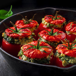 Спанакът се разбърква с половината от сиренето и с тази смес се напълват доматите.
