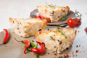1. Предварително включете фурната на 180 градуса. В дълбока купа натрошете сиренето и нарежете на кубчета кашкавала, киселите краставички, маслините, шунката и топеното сирене.