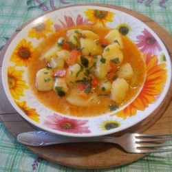 В тенджера се загрява олио и запържваме лук и праз за минута. Добавят се картофите и тиквичката, да се позапържат. Сипва се нарязан ситно червен домат, червеният пипер и наливаме вода да покрие продуктите.