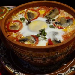 Подреждаме съставките последователно – първо от сместа с каймата, ред е на печената пиперка, поръсваме със сиренето и кашкавала и отново разпределяме равномерно сместа от каймата. Подреждаме отново печена пиперка и поръсваме със сиренето и кашкавала.