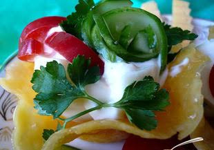 7. Напълнете кошничките със сместа, извадете ги от формичките и доукрасете с цели парчета краставица, пресни подправки и още зеленчуци по желание или маслини и гъби./ kulinarno.bg/