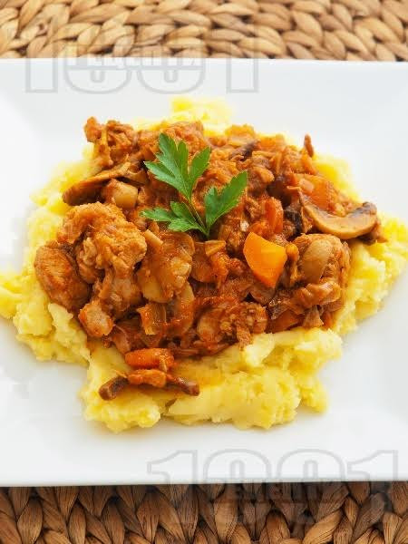 Свинското месо (600 г) се нарязва на средни по големина кубчета и се запържва в олиото (6 с.л.) в дълбок тиган, докато побелее от всички страни. След това към него се добавя морковът (1 бр), нарязан на колелца, а после на четвъртинки, както и празът (2 стръка), нарязан на колелца. Докато месото и зеленчуците се задушават, гъбите (1/2 кг) се измиват и нарязват на полумесеци. Добавят се в тенджерата при останалите продукти, заедно с подправките - сол, черен и червен пипер.