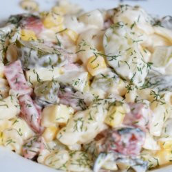 Отцежда се и царевицата. Останалите съставки също се нарязват на кубчета. Като са се охладили макароните добавяме вече нарязаните съставки. И объркваме много добре.