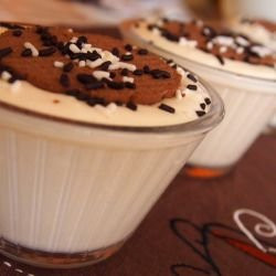 Поставяме бисквитите в подходяща купичка или чашка, отгоре слагаме малко от крема, пак бисквита крем и така подреждаме до горе.
