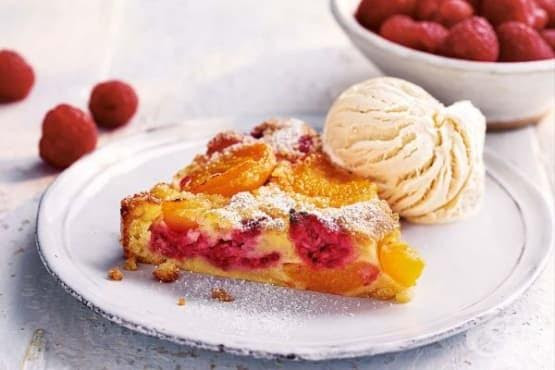 Половината от кайсиите и малините сложете в приготвената тава, а отгоре полейте с тестото. Следва да подредите останалите плодове, по възможност с отрязаната страна нагоре.