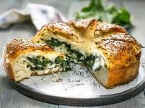 Саламуреното сирене се натрошава и се смесва със сиренето котидж. Тестото се разделя на 6 части, от които се разточват кръгли кори. Първата кора се маже с масло, ръси се със сирена, следват кора, масло, спанак и така, докато свършат продуктите, завършва се с кора. Краищата се прегъват навътре. Форма за торта с диаметър 26 см се застила с хартия за печене, намазва се с масло.