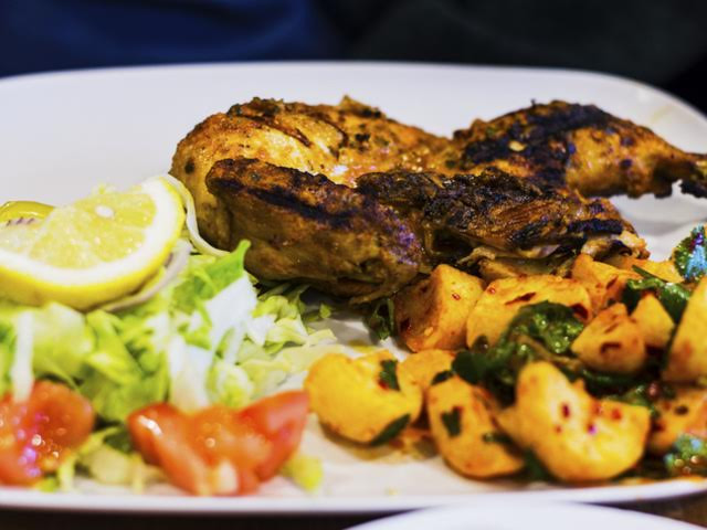 Сложете в купа съставките за маринатата и ги разбъркайте добре. Прибавете месото и отново разбъркайте, за да може всяка част от него да се маринова. Сложете го в хладилник за поне 20 минути (максимум за 1 час). Когато е почти мариновано, в дълбока купа сложете нарязаните като за печене картофи и прибавете към тях подправките и зехтина, разбъркайте.
