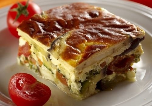 Вземете правоъгълна тава и я подмазнете. Започнете да редувате ред патладжан, ред картофи, тиквички, като помежду им разпределяте от запържените зеленчуци с домати и отново по малко подправки по желание.