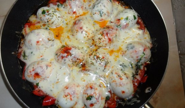 Надупени яйца с кашкавал и чушки се консумира топло.