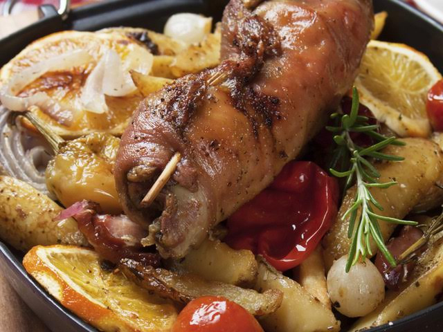 Месото се разстила на тънко, отгоре се слага плънката и се завива на руло. Завързва се с канап по дължината, за да не се развива по време на печенето. Слага се в намаслена и сгорещена тава и се запържва за няколко минути от всички страни . Печем на 200 градуса около 1 час.