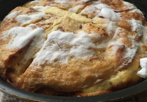 Разрязваме внимателно на кръст с остър нож и отгоре на палачинковия сладкиш с райска ябълка на няколко места поставяме парченца масло.