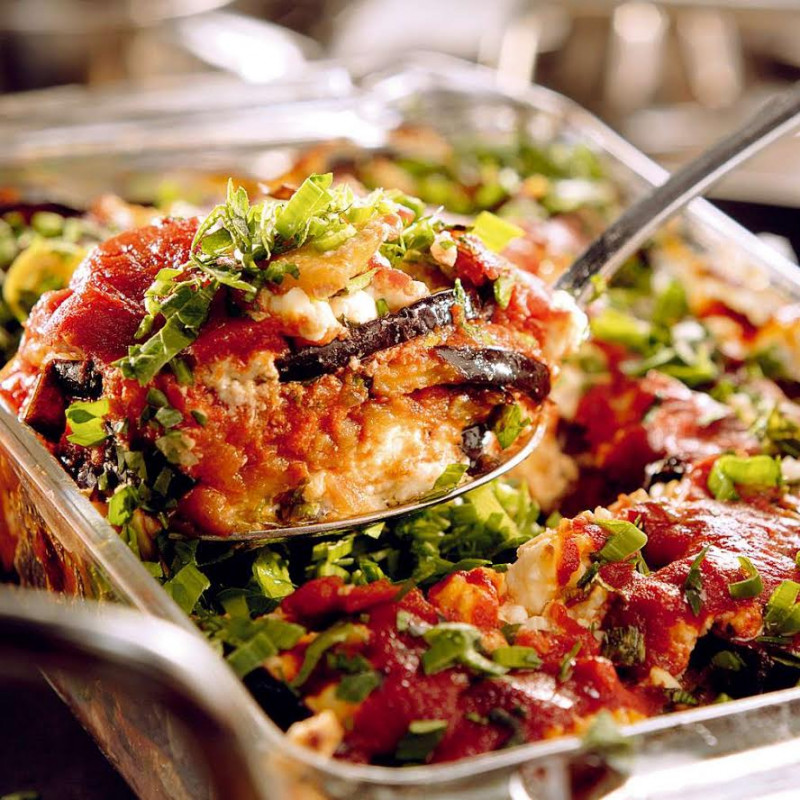 В предварително намазнени гювечета (ястието може да се приготви и в друг подходящ съд) се слагат по 1-2 с. л. от доматения сос, по 2 филийки патладжан, поръсва се с натрошено сирене и се покрива с патладжани. Слагат се по 2 с. л. сос, поръсва се с нарязания на ситно пресен лук, с натрошено сирене и наситнения магданоз.