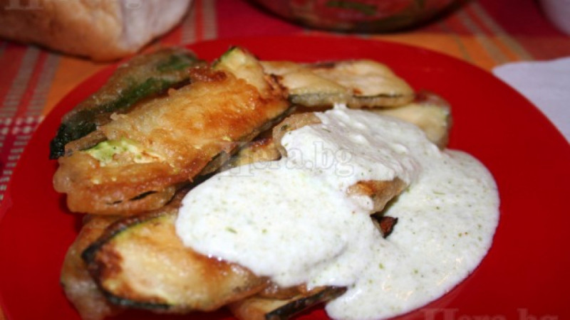 Тиквичките се попиват с кухненска хартия, потапят се в панировката и се пържат на силен котлон до зачервяване.