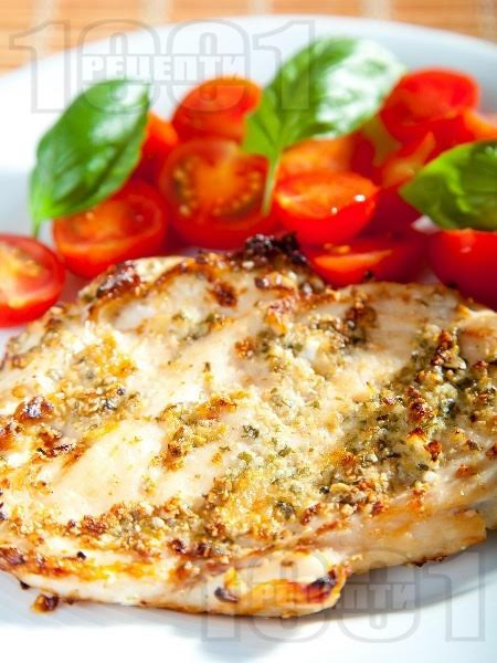 Пилешките гърди (2 бр) се овкусяват със сол и черен пипер на вкус и се начукват, за да станат още по-крехки. Лукът (1 глава) и чесънът (2 скилидки) се нарязват на много ситно и се задушават до омекване в зехтина (2 с.л.).