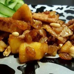 Сипете при месото виното + сока от лимона .Прибавете ябълката, стафидите, ананаса и лука. Оставете да къкри до извиране на течността.