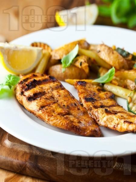 Пилешкото филе (1/2 кг) се начуква, за да стане още по-крехко, след което се накисва в маринатата, получена от разбитите водка (100 мл.), прясно изцеден лимонов сок (1 бр), пресован чесън (6 скилидки), зехтин (4 с.л.), мед (4 с.л.) и сол. Оставя се да киснe в тази марината за половин час, след което пържолите се пекат в сгорещен тиган или на скара. Поднасят се топли с гарнитура от свежа салата според сезона, ориз или картофи./1001recepti.com