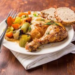 Поднесете пилето с печените зеленчуци, соса и филии от франзела, напръскани със зехтин и запечени на скара или на фурна. /ezine.bg