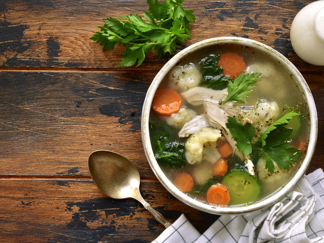 Загрейте зехтина в тенджера. В него запържете лука, целината, чесъна и карфиола. Залейте с бульона. Добавете морковите, пилешкото, подправките. Оставете да кипне, намалете температурата и оставете да къкри за 20 минути. След това прибавете тиквичките и варете още няколко минути. /az-jenata.bg