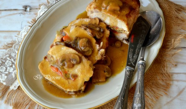 НЕОБХОДИМИ СЪСТАВКИ свинско контрафиле - 1 кг гъби - 200 г моркови - 2 - 3 бр. бяло вино - 100 мл зеленчуков бульон - 200 мл черен пипер чесън - 2 - 3 бр. скилидки краве масло - 50 г зехтин - 1 к.ч. розмарин - 1 клонче брашно - 1 с.л. НАЧИН НА ПРИГОТВЯНЕ Наситнете чесъна и игличките розмарин с остър нож. Срежете свинското контрафиле на книжка. Овкусете със сол, смлян черен пипер и наситнения розмарин и чесън. Сварете морковите в подсолена вода. Нарежете гъбите на филийки и ги задушете за 5-6 мин в кравето масло с щипка сол. Нарежете сварените моркови на кубчета.