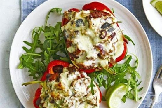 Обърнете чушките и ги напълнете със зеленчуковата смес, колкото се може по-плътно. Покрийте с яйцето и сиренето. Запечете за 10 минути.