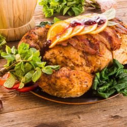 Зашийте отвора, сложете го в подходяща намазнена тава и разпределете парченца сланина отгоре.