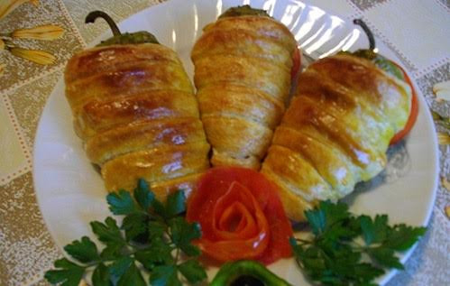 После спираловидно се навива лента от бутер тесто около чушката ( обличаме я).