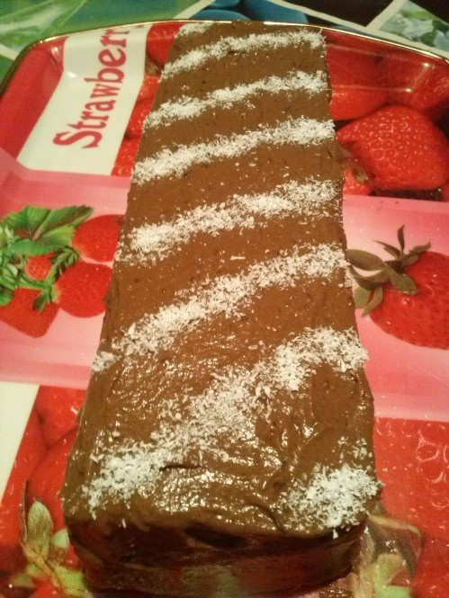 Рулото се маже отгоре и отстрани с останалия крем и се украсява с кокосови стърготини.