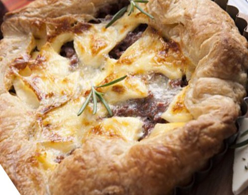 3. Изсипва се върху тестото, намазва се с люто топено сирене или друг лют крем за мазане, наръсва се обилно с настъргания кашкавал и се похлупва с краищата на бутертестото, докъдето стигат.