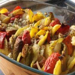 Картоф, чушка, картоф, чушка, тиквичка, карфиол, лук... След като всички зеленчуци се наредят, се овкусяват със сол и черен пипер. Поръсват се с риган и магданоз. Поръсва се и с малко олио.