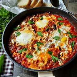 Поръсваме шакшука с натрошеното сирене и готвим под капак 10-12 минути.
