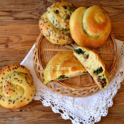 Разбийте един жълтък с две супени лъжици зехтин и две прясно мляко. Намажете с четка спаначените кравайчета с бекон. По желание можа да ги поръсите с микс от семена.