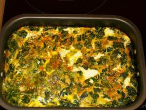 Разбитите яйца, разбъркани със сметаната и подправени със сол, накълцан на дребно магданоз и чер пипер се изливат отгоре.
