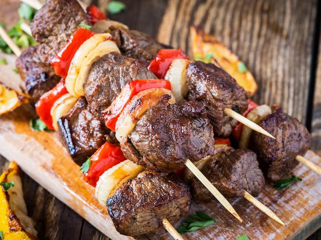Нарежете месото на кубчета като за шиш. В купа комбинирайте съставките за маринатата и сложете нарязаното месо. Оваляйте го добре. Покрийте купата с фолио и оставете месото в хладилник за 3-6 часа, за да се маринова. Ако ползвате дървени шишчета, преди да наредите върху тях месото и зеленчуците трябва да ги намокрите с вода, за да не се запалят във фурната или на скарата. Наредете месото и нарязаните зеленчуци и опечете шишчетата. /az-jenata.bg