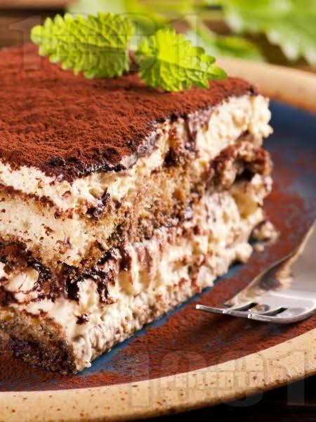 Тирамисуто се покрива с фолио и се поставя в хладилника за час. След това се изважда и се поръсва обилно с какао (30 г). Нарязва се на парчета и се сервира./1001recepti.com