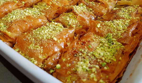 Тук е важно да се знае, че пече ли се на високи градуси, баклавата се препича само отгоре и отдолу, а вътрешността остава сурова! 6. Приготвя се сироп от изброените продукти, които се варят 15 минутки.Цитрусовите кори се отстраняват, капват се 2-3 капки лимонов сок, за да се предодврати бъдещо захаросване. 7. Горещият сироп се залива върху баклавата и се оставя няколко часа или една нощ хубаво да попие. На някои може да се стори много количество за тези кори, но за моят вкус е идеално, защото обичам сочна, добре сиропирана баклава, с много масло и орехи и с разкошна плънка. 8. Преди поднасяне се поръсва с фино смлени ядки от шамфъстък, които е добре да се запекат на сух тиган ако са сурови. Така ще пуснат аромата си. Сладко удоволствие, което няма да остави никого безразличен!/ Снимка: Йорданка Ковачева,gotvach.bg/