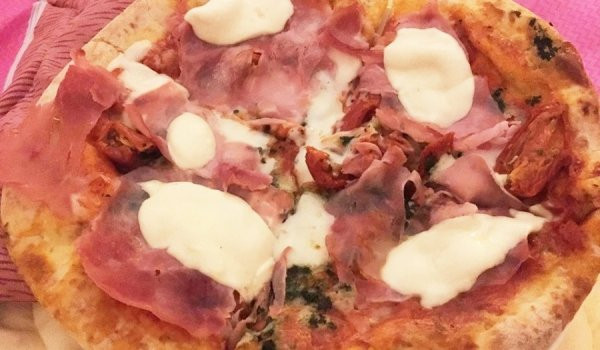НЕОБХОДИМИ СЪСТАВКИ тесто за пица - готово доматено пюре - 30 г за намазване моцарела - 1 бр. чери доматки - 6 - 7 бр. песто - 5 ч.л. шунка - 6 бр. нарязана на тънко (купена) кашкавал - 50 г НАЧИН НА ПРИГОТВЯНЕ Първо разточваме тестото за пица върху лист хартия за печене. Гледаме да я направим в хубава кръгла форма.