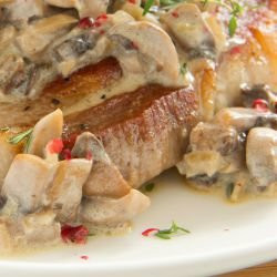 Овкусете вратните пържоли със сол и черен пипер и приберете за 30 минути в хладилник. Загрейте 2 с.л. олио и запържете нарязаните на филии гъби. Пържете до омекване, извадете ги и ги приберете на топло.