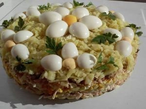 Към овкусената майонеза добавяме киселото мляко и разбъркваме хубаво до получаването на еднородна смес. Във форма за торта с отделящо се дъно (24 см) подреждаме салатата.