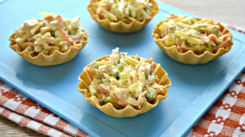 Вземете готови тарталетени кошнички и в тях изсипете получената смес, така че да се получи симпатична на вид конфигурация. За украса може да декорирате с маслина в центъра. Ако пък искате може да приготвите тази закуска/предястие и с малкоразтопено или меко сирене, но не забравяйте да регулирате количеството му, тъй като сместа от зеле вече е овкусена.