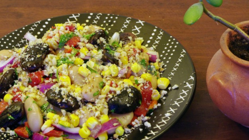 След това го сварете в тенджера под налягане за 40-45 мин. През това време нарежете на ивици печените пиперки, лукът на полукръгчета, а пресните подправки на ситно. Орехите счукайте на дребно. Когато боба се свари, отцедете го и прибавете нарязаните продукти, както и сладката царевица. Овкусете с ябълковия оцет, олиото и солта. По желание можете да допълните рецептата с няколко лъжици доматено пюре или лютеница – комбинацията със зрелия фасул е много сполучлива. След като сервирате салатата в чинии, поръсете я и с натрошените орехи.