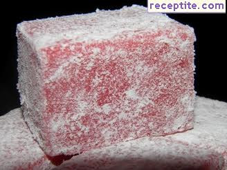 След това сладкишът се изважда на решетка, фолиото се отстранява и формата се оставя да изстине напълно. Чиста, гладка повърхност се наръсва много добре с натурално нишесте, след което върху нея се обръща изпечения сладкиш, който също се покрива с нишесте. Така обработения сладкиш се нарязва с пластмасов нож (аз използвах този от комплекта с пластелин на щерката) на хапки, които също се овалват в нишесте и се поставят върху кухненска хартия в подходящ съд.
