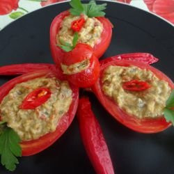 Доматите накълцайте на парченца, леко ги изпържете в останалото олио, изчакайте ги да изстинат и ги смесете с патладжаните, лука, ябълката и яйцата.