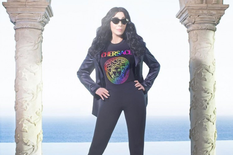 Шер сподели за новата колекция и пред последователите си в Instagram. Тя публикува снимка, на която позира с черна тениска, върху която е изписано „Шерсаче“ и отдолу блести логото на Versace. И двете са оцветени в цветовете на дъгата.