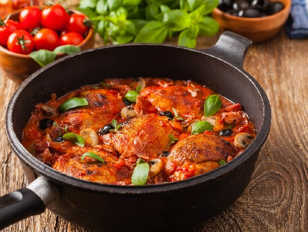 Пиле Качаторе - италианска ловджийска яхния с пилешки бутчета, червено вино, чушки и гъби, сушени домати и босилек