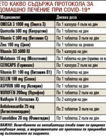 Леките форми на коронавируса се лекуват в домашни условия с коктейл от витамини, цинк, селен и мелатонин. Към минералите и витамините се включва и аспирин, а в някои случаи и противосъсирващи медикаменти, както и хранителни добавки, които влияят положително върху кръвообращението и кръвосъсирването и помагат да се намали вероятността от образуване на тромб.